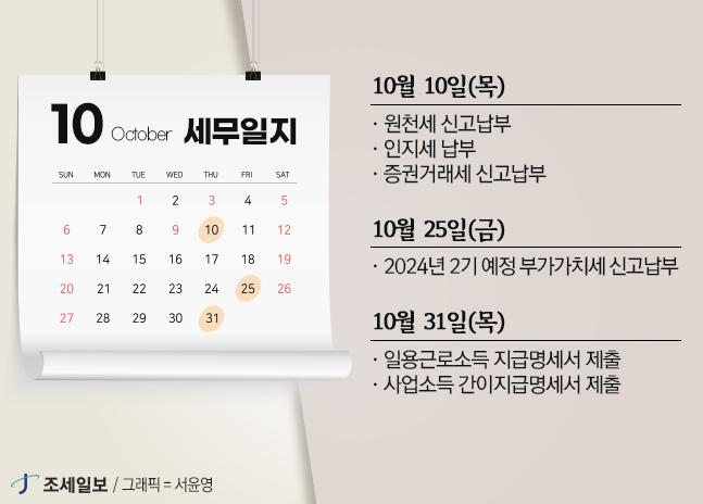 Á¦2±â ºÎ°¡°¡Ä¡¼¼ ¿¹Á¤½Å°í¡¤³³ºÎ '25ÀÏ'±îÁö¿Ï¿¬ÇÑ °¡À»ÀÌ ½ÃÀÛµÈ 10¿ù. »ç¾÷ÀÚ¶ó¸é Á¦2±â ºÎ°¡°¡Ä¡¼¼ ¿¹Á¤½Å°í·³³ºÎ¸¦ ÀØÁö ¸»ÀÚ. ºÎ°¡°¡Ä¡¼¼´Â Å©°Ô 1¿ù·7¿ù È®Á¤½Å°í¿Í 4¿ù·10¿ù ¿¹Á¤½Å°í·Î ³ª´¶´Ù. ÀÌ´Þ 25ÀÏÀº Á¦2±â ºÎ°¡°¡Ä¡¼¼ ¿¹Á¤½Å°í·³³ºÎ±âÇÑÀ¸·Î, Áö³ 7¿ù 1ÀϺÎÅÍ 9¿ù 30ÀϱîÁö 3ºÐ±â µ¿¾È ¹ß»ýÇÑ ºÎ°¡°¡Ä¡¼¼¸¦ ¹Ì¸® ½Å°í ¹× ³³ºÎÇØ¾ß ÇÑ´Ù. °³Àλç¾÷ÀÚ ¶Ç´Â 2024³â »ó¹Ý±â ¸ÅÃâ 1¾ï5000¸¸¿ø ¹Ì¸¸ÀÇ ¼Ò±Ô¸ð ¹ýÀÎÀÇ °æ¿ì, ¼¼¹«¼°¡ Á÷Àü°ú¼¼±â°£(1~6¿ù) ³³ºÎ¼¼¾×ÀÇ 50%¸¦ ¿¹Á¤°íÁöÇϹǷΠ¿¹Á¤°íÁö¼¿¡ µû¶ó ºÎ°¡¼¼¸¦ ³³ºÎÇÏ¸é µÈ´Ù. °íÁö¼¼¾×ÀÌ¶óµµ ³³ºÎ±âÇÑ ³» ³³ºÎÇÏÁö ¾ÊÀ» °æ¿ì, ü³³¼¼¾×ÀÌ µÇ¹Ç·Î ÁÖÀÇÇØ¾ß ÇÑ´Ù. ¼Ò±Ô¸ð ¹ýÀÎÀ» Á¦¿ÜÇÑ ¹ýÀÎ »ç¾÷ÀÚÀÇ °æ¿ì, 2024³â 7~9¿ù¿¡ ´ëÇÑ ºÎ°¡°¡Ä¡¼¼¸¦ Á÷Á¢ °è»êÇØ ¿¹Á¤½Å°í·³³ºÎÇØ¾ß ÇÑ´Ù. ÀÌ·¸°Ô ¹Ì¸® ³³ºÎÇÑ ºÎ°¡°¡Ä¡¼¼´Â ´ÙÀ½ÇØ 1¿ù 25ÀÏ Á¦2±â ºÎ°¡°¡Ä¡¼¼ È®Á¤½Å°í ½Ã Á¤»êµÈ´Ù. ÇÑÆí, ¸Å´Þ 10ÀÏÀº ¿øÃµÂ¡¼öºÐ ½Å°í³³ºÎ, ÀÎÁö¼¼ ³³ºÎ, Áõ±Ç°Å·¡¼¼ ½Å°í³³ºÎÀÏÀÌ´Ù. ¶Ç, 2024³â 9¿ùºÐ ÀÏ¿ë±Ù·Î¼Òµæ Áö±Þ¸í¼¼¼¿Í »ç¾÷¼Òµæ °£ÀÌÁö±Þ¸í¼¼¼, ¿ë¿ªÁ¦°øÀÚ¿¡ °üÇÑ °ú¼¼ÀÚ·á µîÀº ¿À´Â 31ÀϱîÁö ÀØÁö ¸»°í Á¦ÃâÇØ¾ß ÇÑ´Ù. [10¿ù 10ÀÏ(¸ñ) ¼¼¹«ÀÏÁö] ¡ã¿øÃµ¼¼ ½Å°í³³ºÎ ¡ãÀÎÁö¼¼ ³³ºÎ ¡ãÁõ±Ç°Å·¡¼¼ ½Å°í³³ºÎ [10¿ù 25ÀÏ(±Ý) ¼¼¹«ÀÏÁö] ¡ã2024³â 2±â ¿¹Á¤ºÐ ºÎ°¡°¡Ä¡¼¼ ½Å°í³³ºÎ [10¿ù 31ÀÏ(¸ñ) ¼¼¹«ÀÏÁö] ¡ãÀÏ¿ë±Ù·Î¼Òµæ Áö±Þ¸í¼¼¼ Á¦Ãâ ¡ã»ç¾÷¼Òµæ °£ÀÌÁö±Þ¸í¼¼¼ Á¦Ãâ ¡ã¿ë¿ªÁ¦°øÀÚ¿¡ °üÇÑ °ú¼¼ÀÚ·á Á¦Ãâ ¡ã°³º°¼Òºñ¼¼, ±³Åë·¿¡³ÊÁö·È¯°æ¼¼ ½Å°í³³ºÎ Á¶¼¼ÀϺ¸ / À±ÇýÁø ±âÀÚ hjyun@joseilbo.com |