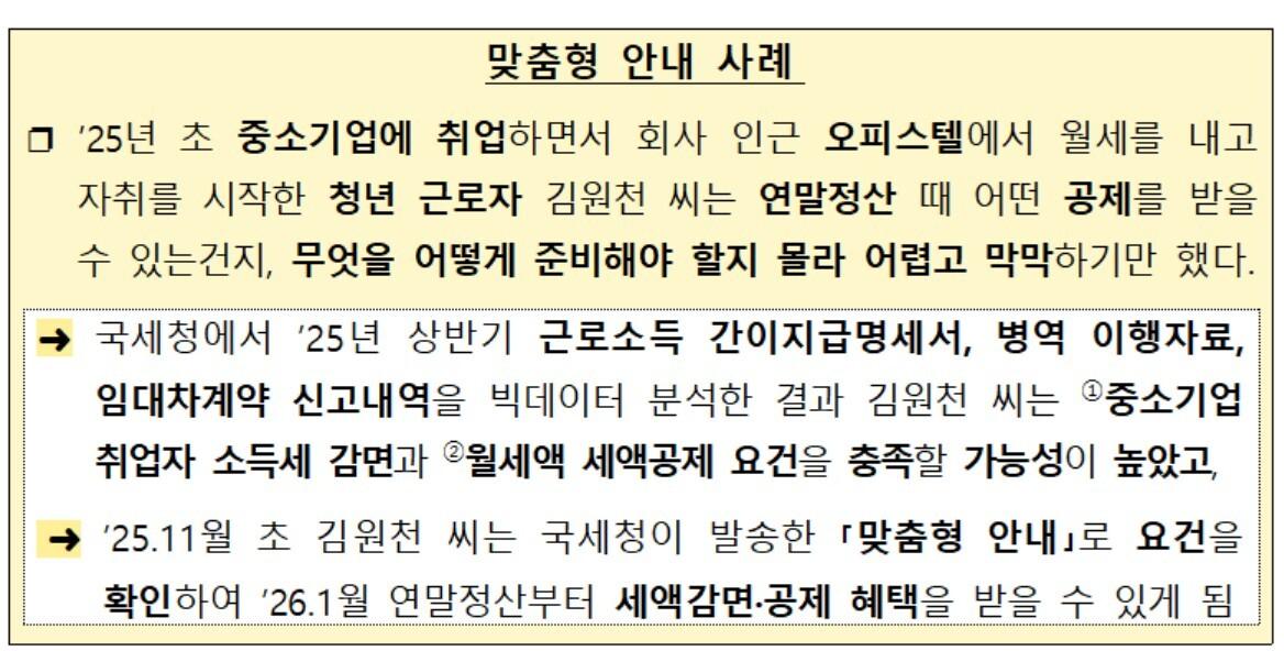 ¿¬¸»Á¤»ê ¹Ì¸®º¸±â¸¦ ÅëÇØ ¿ÃÇØ 1∼9¿ù ½Å¿ë·Ã¼Å©Ä«µå µî »ç¿ë¾×°ú Áö³ ¿¬¸»Á¤»ê ¶§ ½Å°íÇÑ °øÁ¦ ±Ý¾×À» Á¶È¸ÇÒ ¼ö ÀÖ´Ù. ³»³â 1¿ù ¿¬¸»Á¤»ê ¿¹»ó¼¼¾×ÀÌ ¾ó¸¶ÀÏÁö °è»êÇØº¸°í, ¿¬¸» ¼Òºñ·ÀúÃà °èȹÀ» ¼¼¿öº¼ ¼ö ÀÖ´Ù. °áÈ¥·Ãâ»ê µî¿¡ µû¸¥ ºÎ¾ç°¡Á· ³»¿ª º¯°æÀ̳ª ÃÑ ±Þ¿©, ±³À°ºñ, ÀÇ·áºñ µî ¼Òµæ·ÁöÃâ º¯µ¿ÀÌ ¿¬¸»Á¤»ê ¼¼¾×¿¡ ¾î¶»°Ô ¹Ý¿µµÉÁöµµ ¹Ì¸® º¼ ¼ö ÀÖ´Ù. Àͼ÷ÇÏÁö ¾ÊÀº °øÁ¦·°¨¸éÀ» À߸ø Àû¿ëÇÏÁö ¾Êµµ·Ï À¯ÀÇ»çÇ×°ú ÇÔ²² ¼¼±Ý ºÎ´ãÀ» ÃÖ¼ÒÈÇÒ ¼ö ÀÖ´Â Àý¼¼ ÆÁµµ Á¦°øÇÑ´Ù. ¸ÂÃãÇü ¾È³»´Â ¿¬¸»Á¤»ê ¶§ °øÁ¦¹ÞÀº ÀÌ·ÂÀº ¾øÁö¸¸ ºòµ¥ÀÌÅÍ ºÐ¼® °á°ú °øÁ¦´ë»ó¿¡ ÇØ´çÇÒ °¡´É¼ºÀÌ ³ôÀº ±Ù·ÎÀÚ 52¸¸ ¸íÀ» À§ÇØ ±¹¼¼Ã»ÀÌ Á¦°øÇÏ´Â ¼ºñ½º´Ù. ÀÌ ¼ºñ½º´Â īī¿ÀÅå ¹ß¼Û ¹× ³×À̹ö ÀüÀÚ¹®¼ Ãß°¡ ¹ß¼ÛÀ» ÅëÇØ Àü´ÞµÈ´Ù. ±Ù·ÎÀÚº°·Î ¿¬¸»Á¤»ê ¶§ ¹ÞÀ» ¼ö ÀÖ´Â °øÁ¦ Ç׸ñ¿¡ ´ëÇÑ Àû¿ë¿ä°Ç°ú ÇÊ¿ä ÁõºùÀ» ÈÞ´ëÆùÀ¸·Î ¾È³»ÇÑ´Ù. ¿ÃÇØ´Â ¹«ÁÖÅà ±Ù·ÎÀÚ¸¦ À§ÇÑ ¿ù¼¼¾× ¼¼¾×°øÁ¦ Á¦µµ ¾È³»°¡ Àü³â ´ëºñ ´ëÆø È®´ëµÆ´Ù. ¾È³»´ë»óµµ Áö³ÇØ 8¸¸ ¸í¿¡¼ ¿ÃÇØ 15¸¸ ¸íÀ¸·Î ´Ã¾ú´Ù. ¸ÂÃãÇü ¾È³»¸¦ ÀÌ¿ëÇϸé ÀÌ·¯ÇÑ °øÁ¦ Ȱ¿ë ¹æ¹ýÀ» ½±°Ô È®ÀÎÇÒ ¼ö ÀÖ´Ù. ¿¬¸»Á¤»ê ³»¿ª ¹× ÇÐÀÚ±Ý »óȯÀÌ·Â µî ³»·¿ÜºÎ ÀÚ·áµµ ±¹¼¼Ã»ÀÌ ºÐ¼®ÇÏ°í ¾È³»ÇØÁØ´Ù. ƯÈ÷ ¿¬¸»Á¤»ê ¶§ ¹®Àǰ¡ ¸¹Àº ¡ãÀå±âÁÖÅÃÀú´çÂ÷ÀÔ±Ý ÀÌÀÚ»óȯ¾× ¡ãÁÖÅÃÀÓÂ÷Â÷ÀÔ±Ý ¿ø¸®±Ý »óȯ¾× ¡ãÁÖÅø¶·ÃÀúÃà ¼Òµæ°øÁ¦ ¡ã±³À°ºñ·±âºÎ±Ý·¿ù¼¼ ¼¼¾×°øÁ¦ ¹× Áß¼Ò±â¾÷ Ãë¾÷ÀÚ ¼Òµæ¼¼ °¨¸é µî 7°¡Áö °øÁ¦ ¹× °¨¸é Ç׸ñ¿¡ ´ëÇØ ÀÚ¼¼ÇÏ°Ô ¾Ë·ÁÁØ´Ù. ´Ù¸¸ ¸ÂÃãÇü ¾È³»·Î ºÐ¼®ÇÑ ½ÃÁ¡°ú ½ÇÁ¦ ¿¬¸»Á¤»ê ½ÃÁ¡Àº Â÷À̰¡ Àֱ⠶§¹®¿¡ ¿¬¸» ±âÁØÀ¸·Î´Â °øÁ¦´ë»ó¿¡ ÇØ´çÇÏÁö ¾ÊÀ» ¼ö ÀÖ´Ù. ¸ÂÃãÇü ¾È³»¸¦ ÀÌ¿ëÇÏ´õ¶óµµ ¿¬¸»Á¤»ê ¿Ï·á Àü¿¡ ³³¼¼ÀÚ°¡ Á÷Á¢ ¿ä°ÇÀ» È®ÀÎÇÏ´Â °Ô ±ÇÀåµÈ´Ù. ±¹¼¼Ã»Àº "¿¬¸»Á¤»ê°ú °ü·ÃÇÑ ±Ã±ÝÇÑ »çÇ×Àº ±¹¼¼Ã» Äݼ¾ÅÍ(±¹¹ø¾øÀÌ 126)¿¡¼ º¸´Ù »ó¼¼È÷ ¾È³»¹ÞÀ» ¼ö ÀÖ´Ù"¶ó¸ç "±¹¼¼Ã»Àº ¾ÕÀ¸·Îµµ ±Ù·ÎÀÚÀÇ ¿øÈ°ÇÑ ¿¬¸»Á¤»êÀ» À§ÇÏ¿© ´Ù¾çÇÑ ½Å°íÁö¿ø ¼ºñ½º¸¦ Á¦°øÇϰڴÙ"°í ¹àÇû´Ù. ¡á ¿¬¸»Á¤»ê ¹Ì¸®º¸±â ¹× ¸ÂÃãÇü ¾È³» ¼ºñ½º Q&A Q. '¿¬¸»Á¤»ê ¹Ì¸®º¸±â'¿¡¼ °è»êÇØº¸´Ï ȯ±Þ¼¼¾×ÀÌ ¹ß»ýÇÒ °Í °°Àºµ¥, ±×·³ À̹ø ¿¬¸»Á¤»ê ¶§ ȯ±ÞÀ» ¹ÞÀ» ¼ö ÀÖ´Â °Ç°¡¿ä? A. ÀÛ³â(2024³â ±Í¼Ó) ¿¬¸»Á¤»ê ÀڷḦ ±âÃÊ·Î ¿ÃÇØ ¿¬¸»Á¤»ê °á°ú¸¦ ¹Ì¸® °è»êÇÏ´Â °ÍÀ̹ǷÎ, ¿¬ºÀ·ÁöÃâÀÇ º¯µ¿¿¡ µû¶ó ½ÇÁ¦ °á°ú´Â ´Ù¸¦ ¼ö ÀÖ½À´Ï´Ù. ½ÇÁ¦ ¿¬¸»Á¤»ê ½Ã¿¡´Â ¿¬µµ ¸»(2025³â 12¿ù 31ÀÏ)±âÁØÀ¸·Î ¿ä°ÇÃæÁ· ¿©ºÎ¸¦ ²Ä²ÄÈ÷ ´Ù½Ã È®ÀÎÇÑ ÈÄ ¼Òµæ・¼¼¾×°øÁ¦¸¦ Àû¿ëÇϽñ⠹ٶø´Ï´Ù. Q. '¿¬¸»Á¤»ê ¹Ì¸®º¸±â'¿¡¼ Á¶È¸µÇÁö ¾Ê´Â ½Å¿ëÄ«µå µî »ç¿ë±Ý¾× ÀÚ·á°¡ Àִµ¥, ±× ÀÌÀ¯´Â ¹«¾ùÀΰ¡¿ä? A. ½Å¿ëÄ«µå»ç¿¡¼ ÀϺΠÀÚ·á°¡ Á¦ÃâµÇÁö ¾Ê¾Æ Á¶È¸µÇÁö ¾Ê´Â ÀÚ·á°¡ ÀÖÀ» ¼ö ÀÖÀ¸³ª, 2026³â 1¿ù °³ÅëÇÏ´Â ¿¬¸»Á¤»ê °£¼ÒÈ ¼ºñ½º¿¡¼´Â ÀڷḦ Á¤»ó ¼öÁýÇÏ¿© Á¦°øÇÒ ¿¹Á¤ÀÔ´Ï´Ù. Q. ¿ÃÇØ 20»ìÀÌ µÈ ÀÚ³àÀÇ ÀÚ·áµµ °£¼ÒÈ ¼ºñ½º¿¡¼ È®ÀÎÇÒ ¼ö ÀÖ³ª¿ä? A. ¿ÃÇØ ¼º³âÀÌ µÈ ÀÚ³à(2006³â»ý)¸¦ Æ÷ÇÔÇÑ ºÎ¾ç°¡Á·ÀÇ ÀÚ·á´Â ÇØ´ç °¡Á·ÀÌ ±Ù·ÎÀÚ¿¡°Ô ÀڷḦ Á¦°øÇÏ´Â µ¥ µ¿ÀÇÇØ¾ß Á¶È¸°¡ °¡´ÉÇÕ´Ï´Ù. ¹Ì¼º³â ÀÚ³à(2007³â 1¿ù 1ÀÏ ÀÌÈÄ Ãâ»ý)´Â ºÎ¸ð°¡ ȨÅýº·¼ÕÅýºÀÇ ºÎ¾ç°¡Á· ÀÚ·áÁ¦°øµ¿ÀÇ ½Åû, Á¶È¸, Ãë¼Ò ȸ鿡¼ '¹Ì¼º³âÀÚ³à ½Åû'À» ¼±ÅÃÇÏ¿© ÀÚ·áÁ¦°øµ¿ÀÇ(ºÎ¸ð º»ÀÎÀÇ °øµ¿ÀÎÁõ¼ ¶Ç´Â °£ÆíÀÎÁõ ÇÊ¿ä)¸¦ ½ÅûÇÒ ¼ö ÀÖ½À´Ï´Ù. Q. ¸ÂÃãÇü ¾È³»´Â īī¿ÀÅåÀ̳ª ³×À̹ö ÀüÀÚ¹®¼·Î¸¸ ¹ÞÀ» ¼ö ÀÖ³ª¿ä? A. ¿¬¸»Á¤»ê ¸ÂÃãÇü ¾È³»´Â 11¿ù 6ÀÏ Ä«Ä«¿ÀÅåÀ¸·Î 1Â÷ Àü¼Û ÈÄ ¼Û´ÞµÇÁö ¾ÊÀº °æ¿ì¿¡ ÇÑÇØ 2Â÷·Î ³×À̹ö ÀüÀÚ¹®¼¸¦ ¹ß¼ÛÇÕ´Ï´Ù. ¹®ÀÚ¸Þ½ÃÁö(SMS)³ª ÀüÈ Åëȷδ ¾È³»Çϰí ÀÖÁö ¾ÊÀ¸´Ï ±¹¼¼Ã»À» »çĪÇÑ Çǽ̷½º¹Ì½Ì¿¡ À¯ÀÇÇϽñ⠹ٶø´Ï´Ù. Á¶¼¼ÀϺ¸ / ÀÌÀçÇü ±âÀÚ silentrock@joseilbo.com |